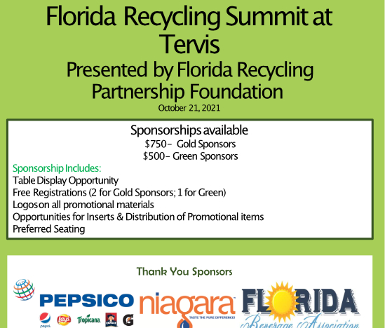 Panelist include Rogan Donelly, President & CEO of Tervis; Rob Harris, Executive Director of Sarasota Manatee Manufacturing Association and Tom Feeney, President & CEO of Associated Industries of Florida. Our moderator will be Steve Lezman – PepsiCo and Chair of the Florida Recycling Partnership Foundation